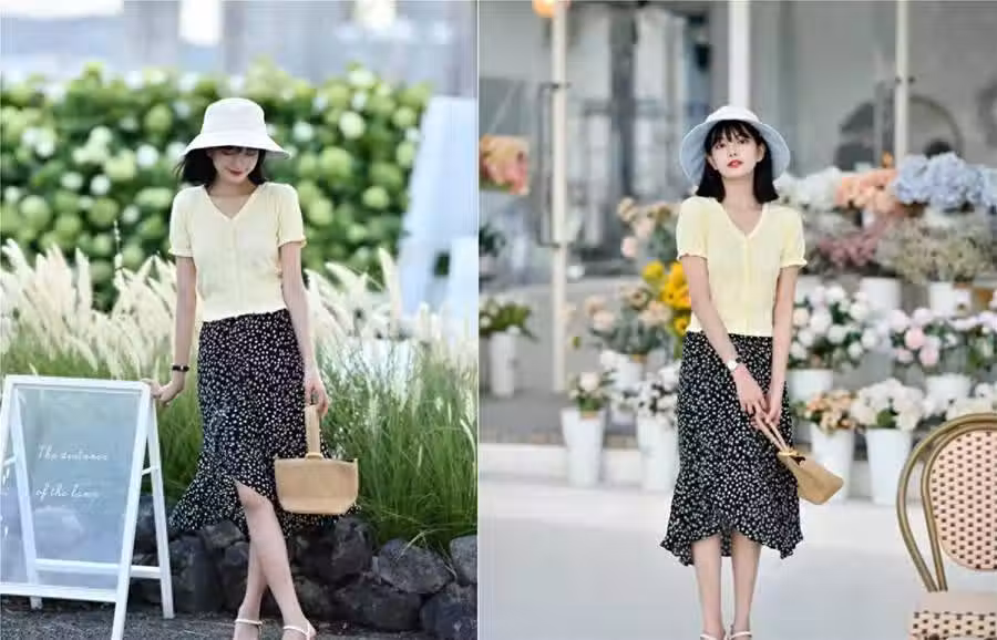 當你穿深色的小衫時,留白的部位一定要小,讓盡量多的深色去包裹你身上肉多的部位,視覺上就會超級顯瘦;尤其是肩膀連接雙臂間的位置。