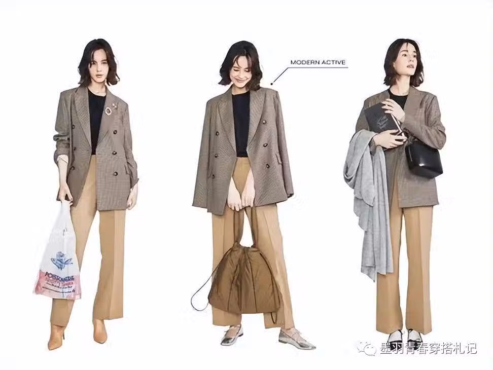在通勤裝束中,西裝外套是非常好用的單品,既可以與嚴肅風格的西裝褲和休閒褲相組合,打造優雅、內斂的格調,也可以搭配各種裙裝形成層次感。卡其色中長款西裝搭配黑色打底和同色系的塗色西裝褲,這種颯爽霸氣的中性之美是不是很吸引人呢?