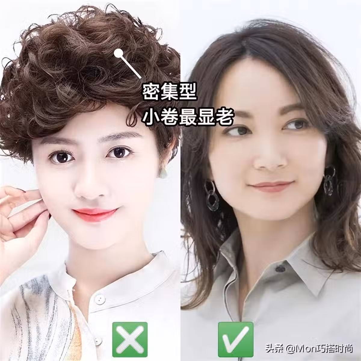 無論你多麼喜歡蓬鬆的小卷發,也千萬別選左邊這種大面積密集型的小卷,分分鐘都能讓你老上五歲,要離得越遠越好!