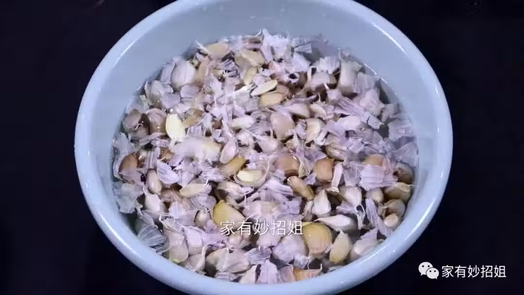 浸泡的時間差不多了,我們再用雙手不停的揉搓大蒜。經過浸泡,大蒜的外皮都被泡軟了,在蒜皮和蒜瓣的中間有了水分,我們簡單的搓一搓,大蒜皮就能輕鬆的被搓掉了。