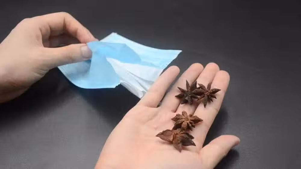 然後準備幾粒八角,將八角塞進一次性口罩的其中一個隔層裡面。