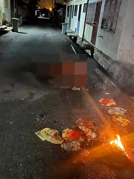 (芙蓉18日訊/獨家報導)8旬華裔老翁使用天那水和烈酒兩種易燃液體,躺臥在金銀紙堆中,在家後巷雙料自焚,了結生命!