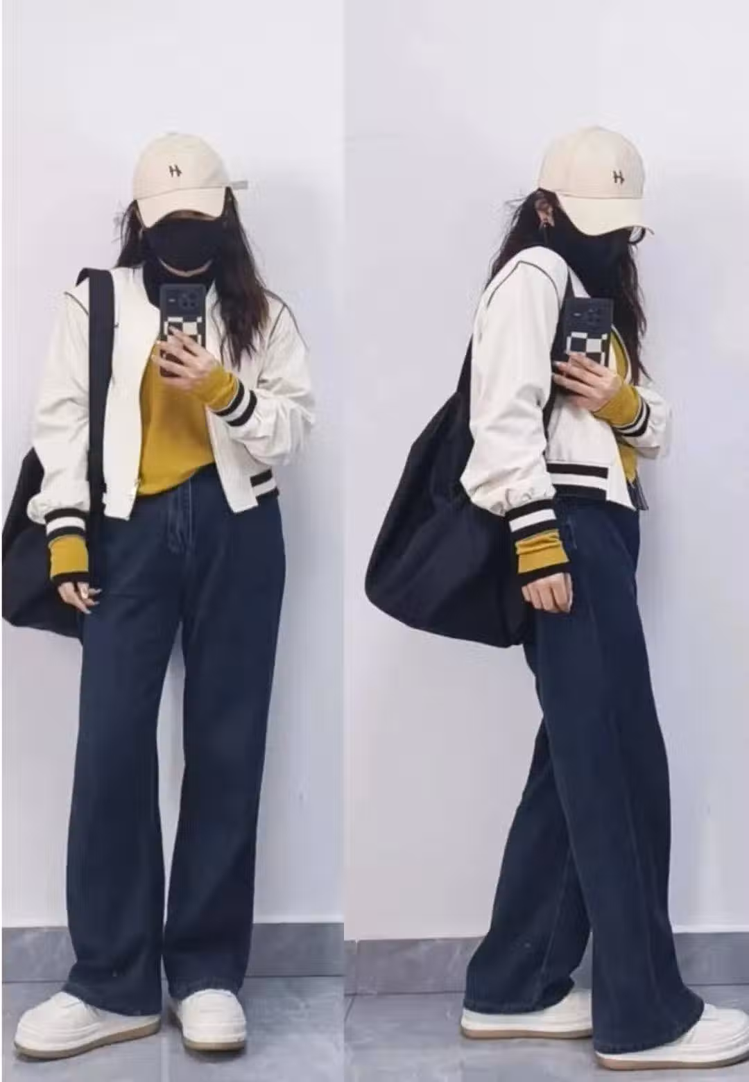 在春天可以多用亮色組合,姜黃色內搭+深藍色牛仔褲就很經典,白色無論跟什麼顏色都很搭,所以這一套顯高還給人感覺舒服干凈。