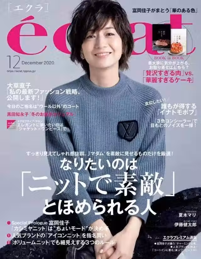 3、圖中這件藍灰色的毛衣看起來簡簡單單,下身搭配一條黑色長褲,富岡佳子盤腿坐在那裡,加上背景的淺灰色,讓人有一種莫名的放鬆。