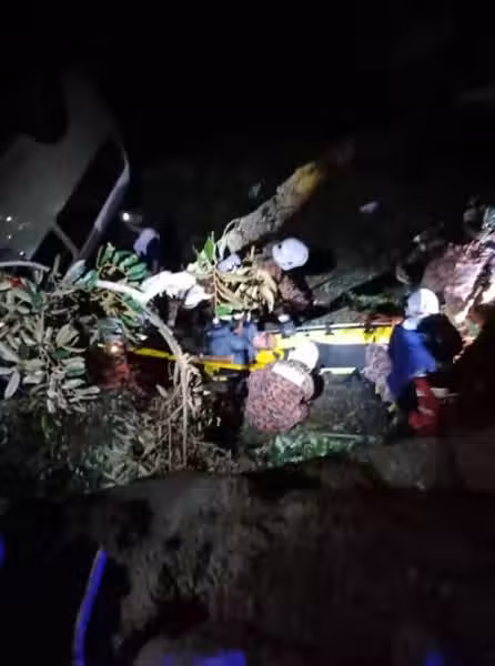 (檳城24日訊)一行人在「小雲頂」的泰國餐廳享用晚餐後,搭車準備返回酒店,豈知經過該斜坡時,客貨車失控從斜坡翻落山坡,9人受困車內。