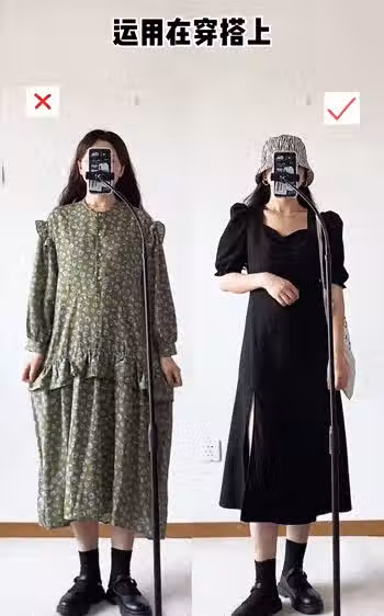 在上面那三段線條中,上V下A的顯長效果最佳,所以穿搭上完全可以也按照「上V下A」的思路來,這比起隨意的穿搭顯得身材比例更好。