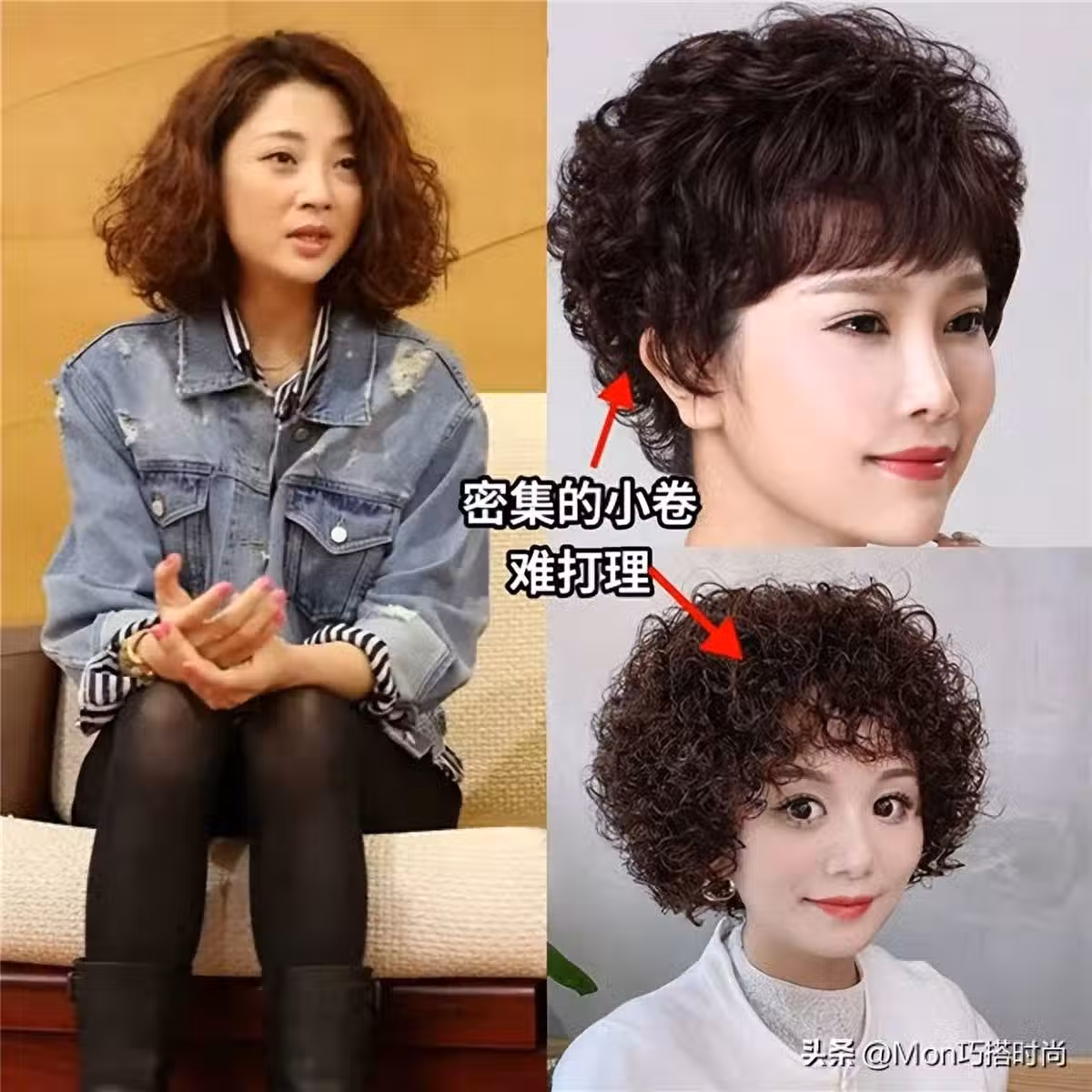 所謂的老年頭其中之一就包括這種密集的小捲髮,這種小捲髮應該是很有代表性的顯老髮型之一了,因為是特別密集的小卷,所以會讓我們的頭髮完全炸起來,如果你們剪短髮的同時燙這種小卷,就會導致髮型看上去十分的油膩,頭大臉大。