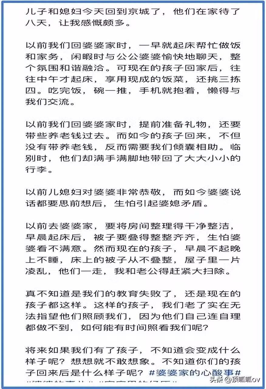 交流。過去的媳婦有話沒話地同公公婆婆聊天,家裡到處充滿了歡樂的氣氛,媳婦對長輩畢恭畢敬。現在的媳婦幾乎與長輩無交流,反倒是長輩想說話的時候前思後想,恐怕哪一句話說錯了惹兒子和媳婦不高興,這難道是新興的婆媳關係?