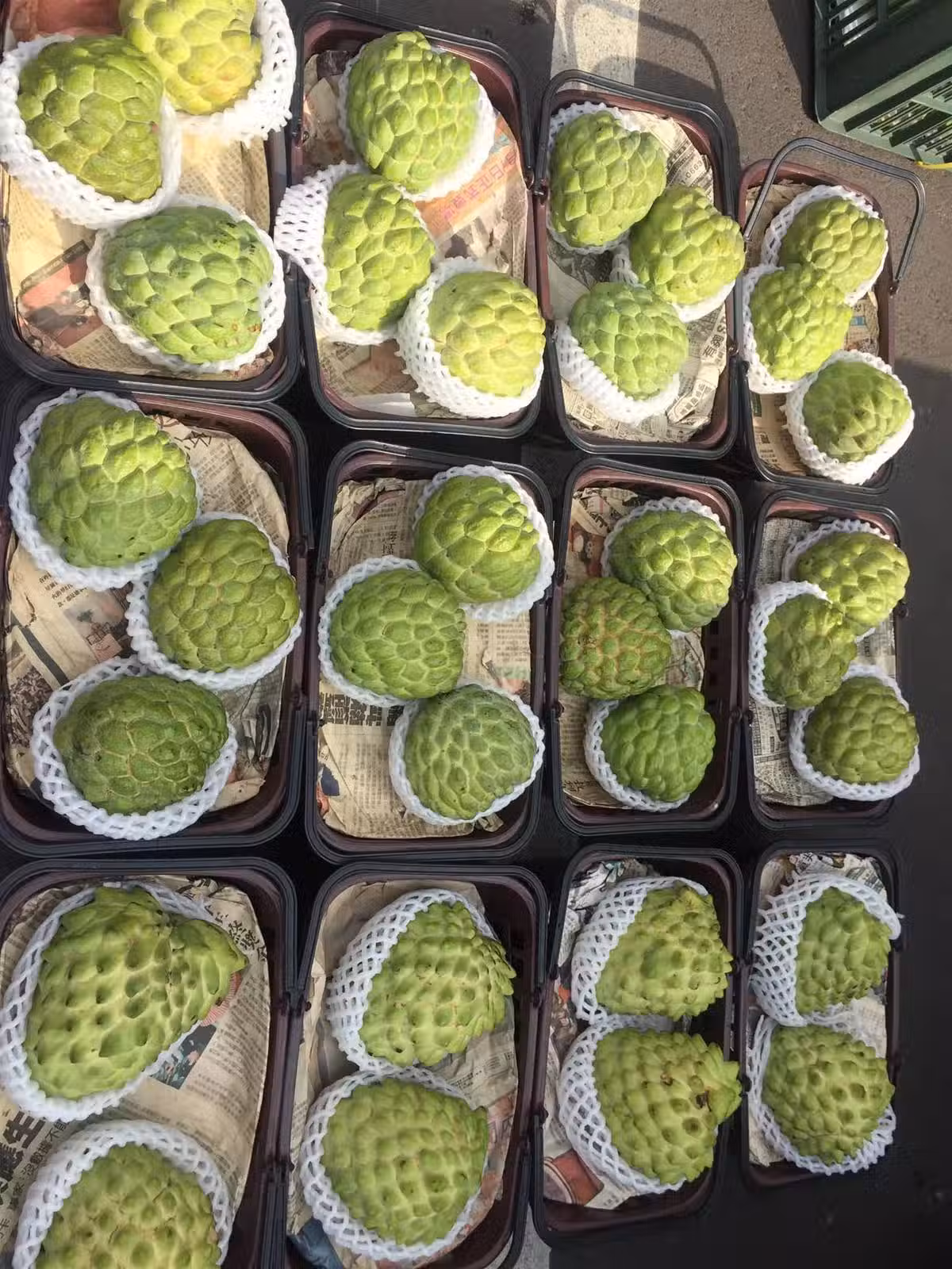 斜對面有一攤賣杏仁茶,一箱150到200 ,300都有,因為每天的釋迦大小都不一,
