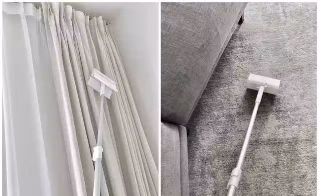 如果是養小孩、養寵物的家庭,免不了會有很多掉落的毛發,而窗簾多孔,很容易粘上毛發,這時可以用粘毛器解決,普通的滾動粘毛器也就幾塊錢一個,芯還可以替換,非常實惠。 固定住窗簾的四個角,上下來回滾動粘毛就可以了。