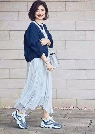 寬鬆的藏青色燈籠袖上衣,配上淺灰色百褶過膝長裙,給人一種優雅又淑女的感覺,腳上是一雙厚底運動鞋,增高又拉長腿長。