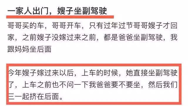 她的標題是:「 一家人出門,嫂子坐副駕駛?」