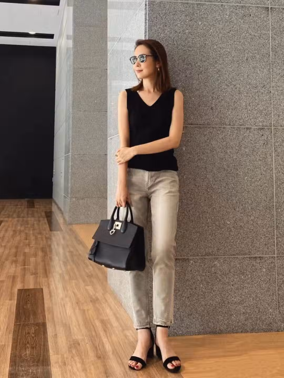 3、無袖背心+牛仔褲用基礎款配基礎款時,藉助露膚設計來提升清爽感,同樣能夠打破造型的呆板無趣,如背心+牛仔褲。