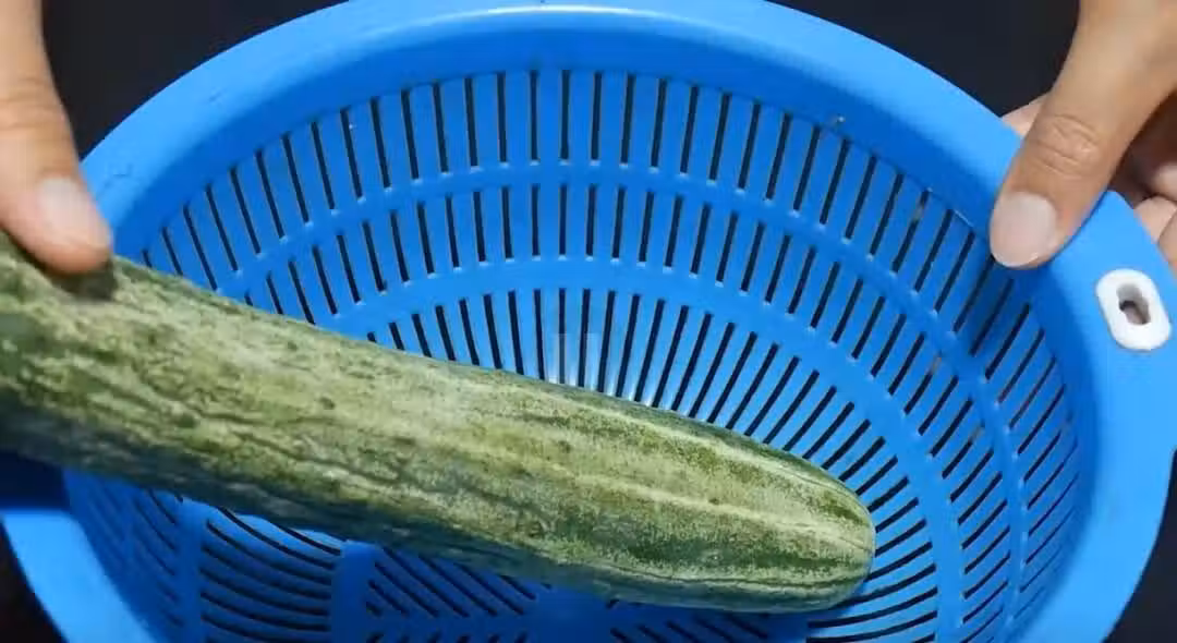 第一個方法,就是咱們拿了一個小筐子,比如說這個菜籃子,然後把這個黃瓜頭朝下蒂部是朝上的,然後把它全部放在這個籃子當中,
