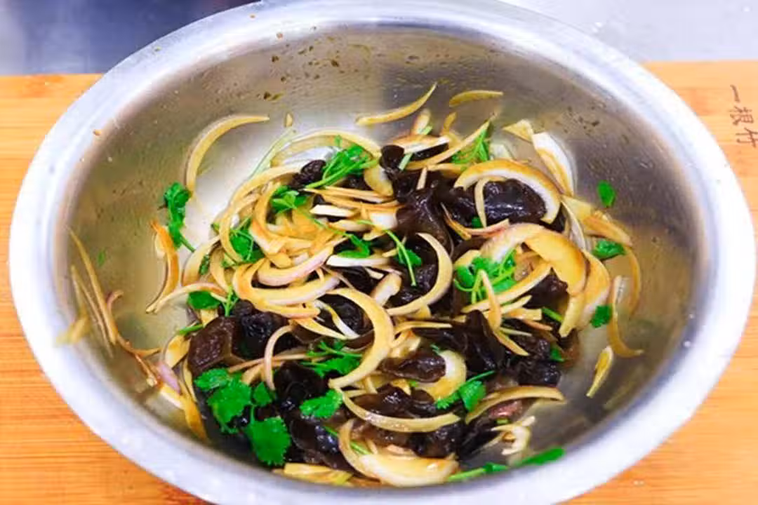 2.加入食鹽2克,白糖5克中和洋蔥的辛辣味,生抽10克,一品鮮醬油5克,香醋10克,再倒入一些芝麻香油顛盆拌勻。