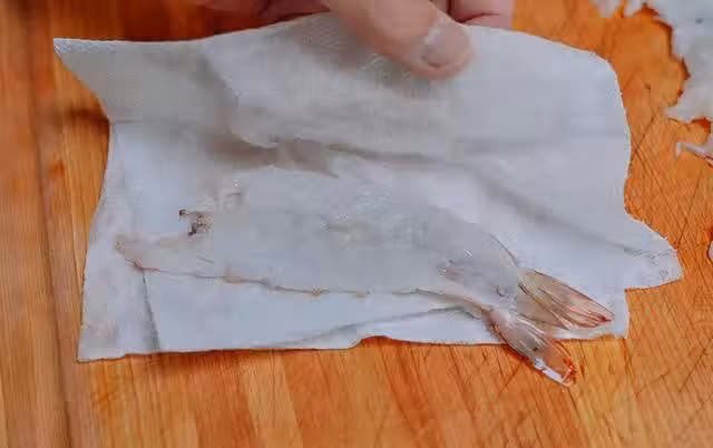 小心的把蝦身上的蝦線去除掉,這樣一個蝴蝶蝦就做好了,用這種方法把所有的蝦都做好,然後再用清水沖洗一下,放到廚房用紙上吸干蝦表面的水分,把蝦背朝下放回到菜板上。