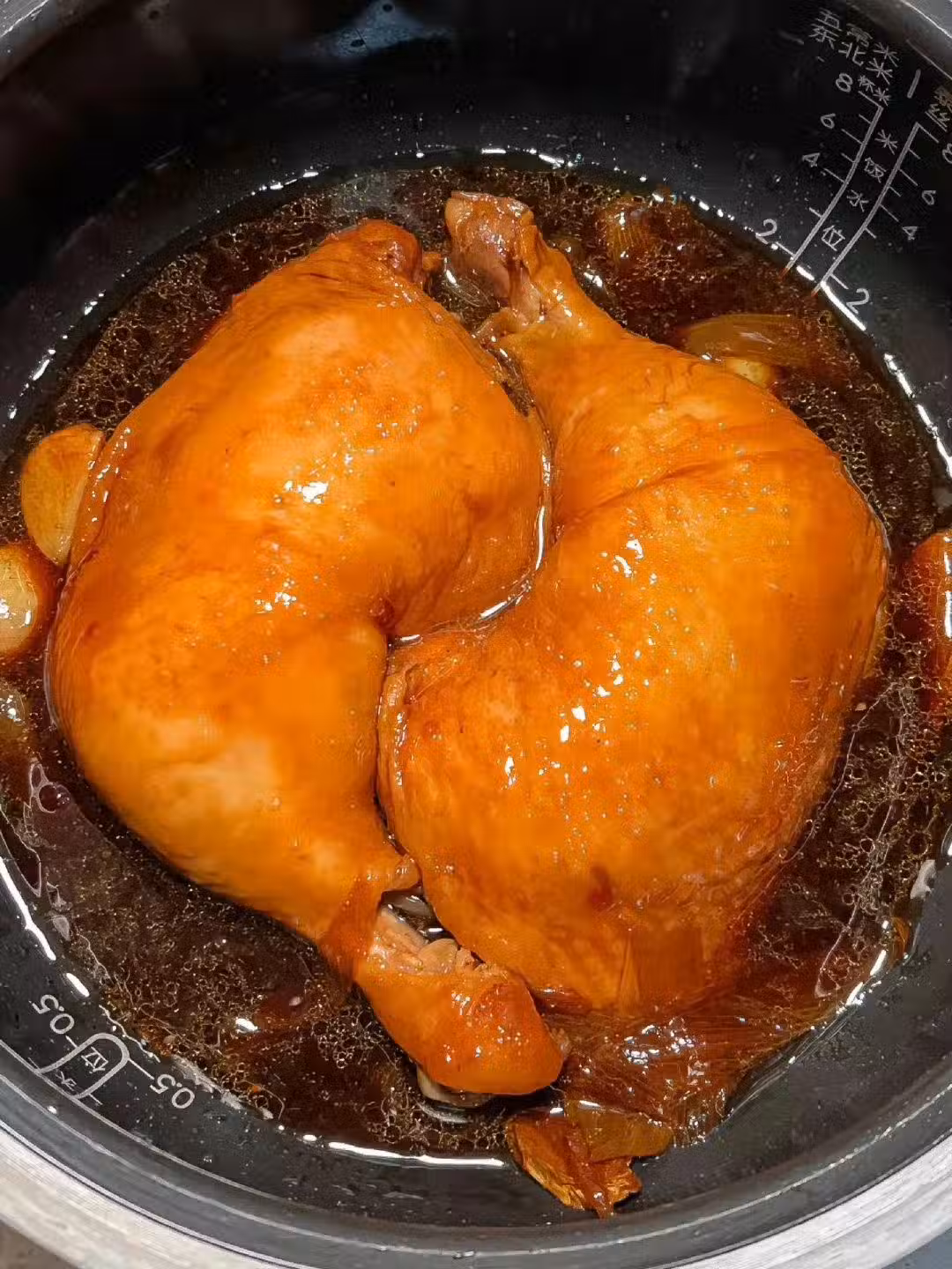 2️⃣電飯鍋噴一點油,放入大蔥蒜粒和薑片,放入雞腿倒入腌雞腿的料汁(料汁就是上面腌雞腿的方法),電飯鍋按煮飯鍵即可。