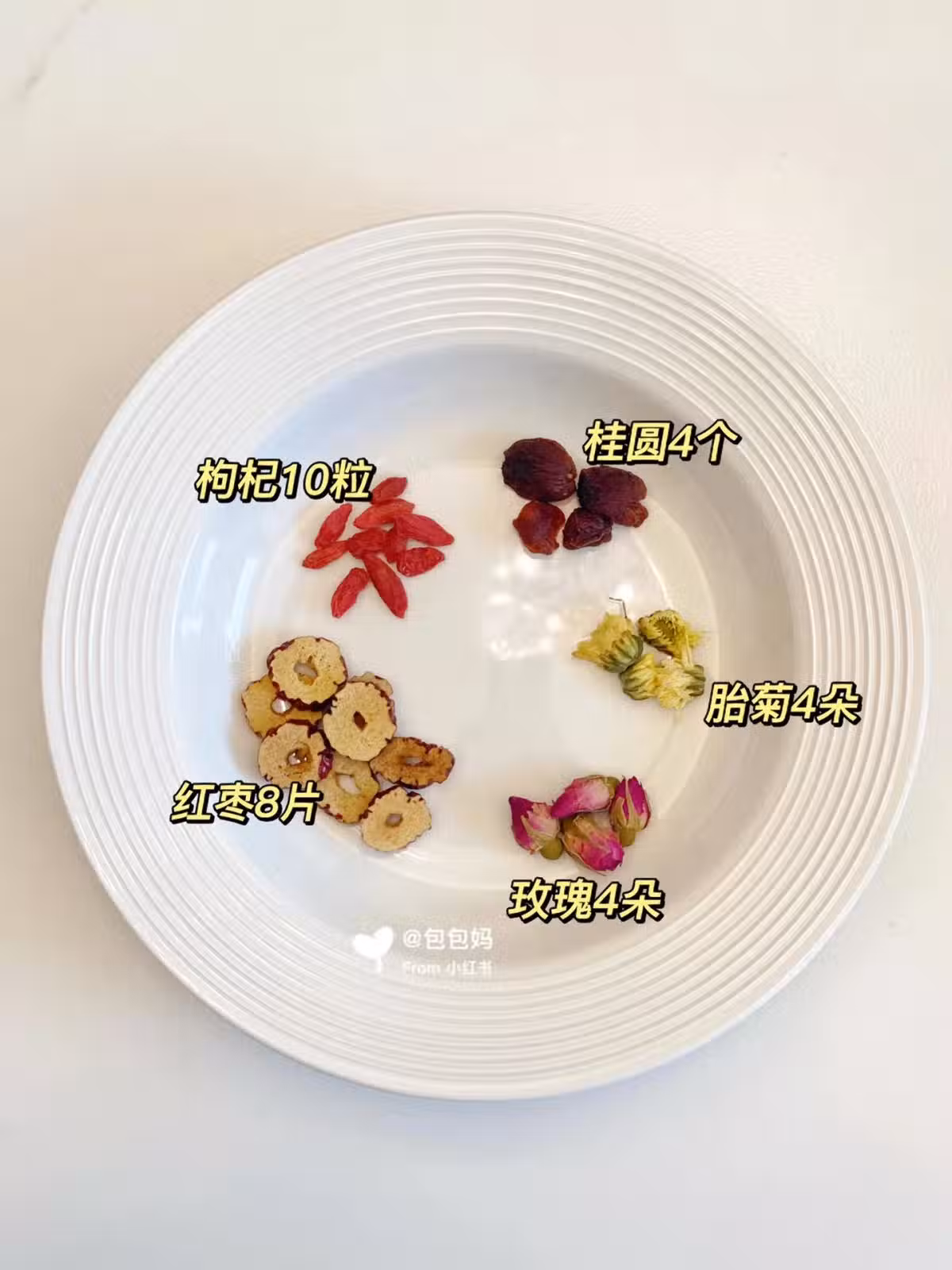 紅棗8片➕枸杞10粒➕桂圓4個➕胎菊4朵➕玫瑰4朵