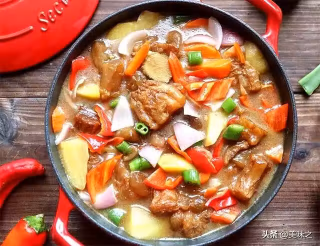 10、土豆、胡蘿蔔、洋蔥切滾刀塊,紅辣椒去籽切塊,青辣椒切段。