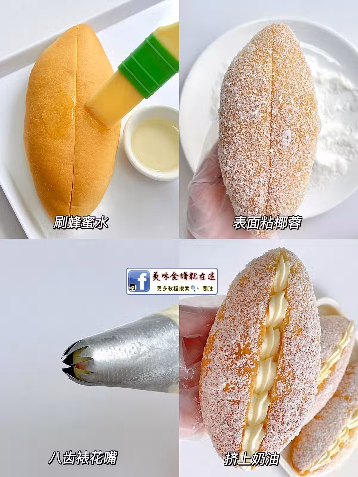 4️⃣麵包中間切開不切斷,表面刷蜂蜜水,粘一層椰蓉,麵包中間擠入咸奶油即可