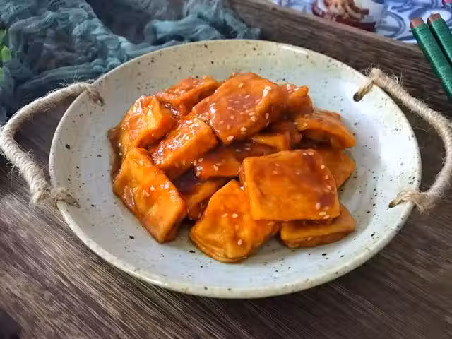 【材料】:石屏豆腐1條,叉燒醬1勺,蚝油1勺,糖適量,麵粉少許,白芝麻1把,油適量