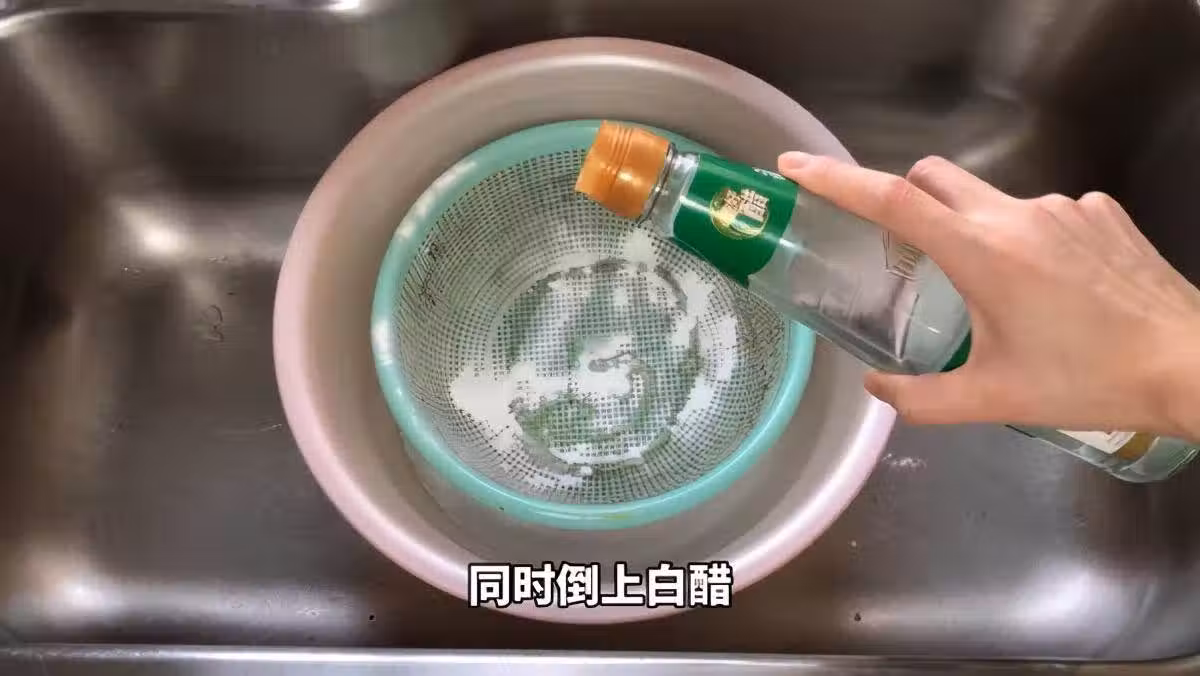 撒完小蘇打再加點白醋,把白醋直接倒在上面,白醋可以去除污垢並且消除異味,而且白醋會和小蘇打發生反應,會更有效地清潔污漬。