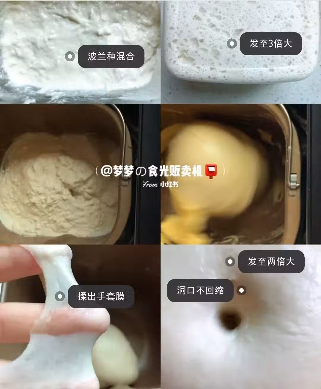 2.】把除黃油以外的其他主麵糰材料和波蘭种放進麵包機,揉至擴展階段如圖狀態即可加入提前軟化好的黃油揉出手套膜