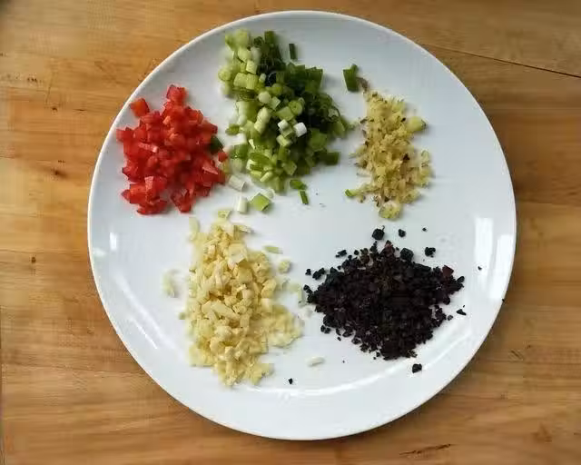 2、在排骨浸泡的時候,我們準備下其它的食材。香蔥、紅辣椒、生薑和大蒜做好清洗和準備工作,然後分別用刀將它們切成末,分別放到調料碟待用。取出一勺豆豉,也用刀剁上幾下,就和其它的食材放到一起,一會再用。