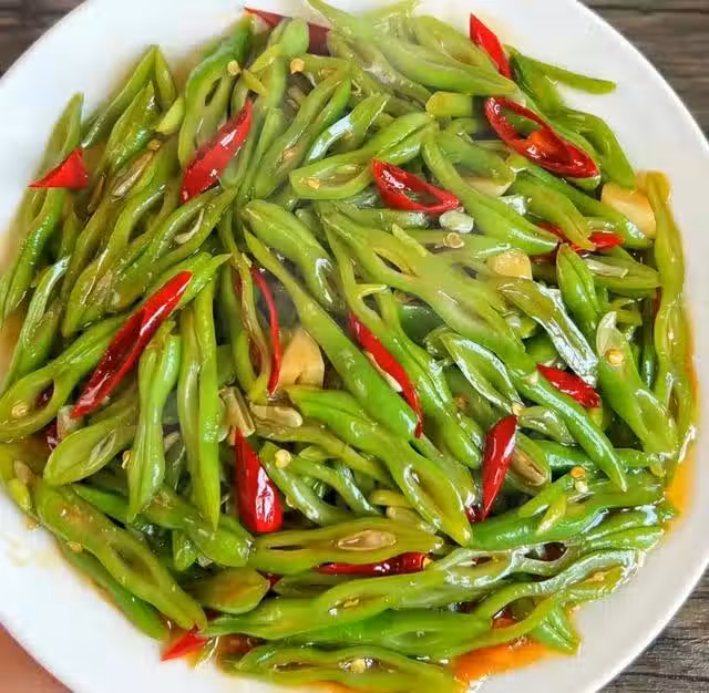 3.鍋中倒油,油熱爆香蒜片、干辣椒 ,倒入四季豆炒軟,再淋入醬汁 ,翻炒均勻,湯汁濃稠後關火。