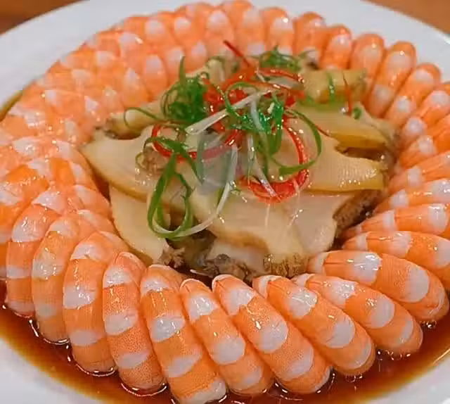 2.再把洗凈的大蝦放入鍋中煮兩到三分鐘,煮熟後撈出剝去外殼,像圖片一樣整齊地擺入盤中,盤中間擺上鮑魚片,放蔥絲,紅椒絲淋上熱油,最後再淋入蒸魚豉油即可。這道菜又鮮又嫩,寓意招財進寶,財源滾滾。