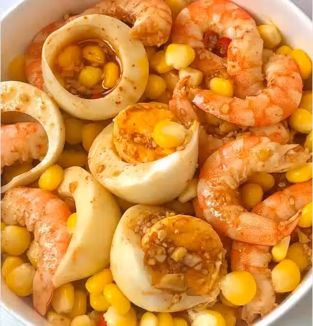 食材準備:玉米、雞蛋、蝦、大蒜、小米辣、辣椒麵、熟芝麻、生抽、食鹽、香醋