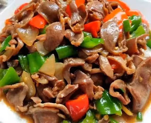 3.鍋內再放少量食用油,放入青紅椒、洋蔥、食鹽翻炒斷生,再加入雞胗、泡椒、一勺生抽、幾滴老抽翻炒均勻撒上蔥花即可出鍋。這樣炒的雞胗很嫩,香辣開胃,非常下飯。