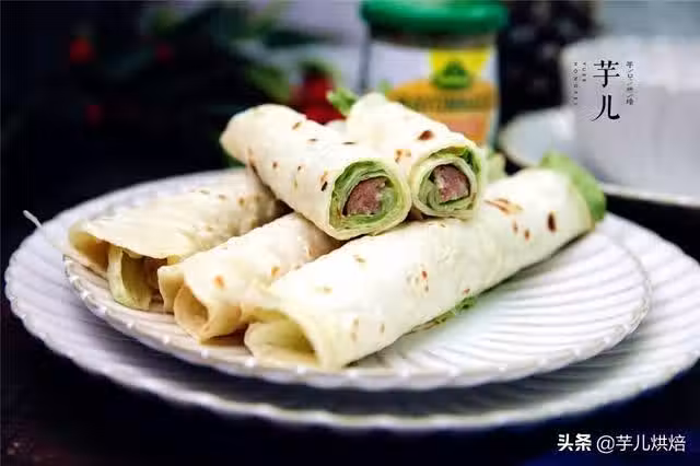 5.取一片烙餅,抹上一層沙拉醬。放上一片洗凈的生菜,再放上一條切好的烤腸,捲起來,就可以開吃了。