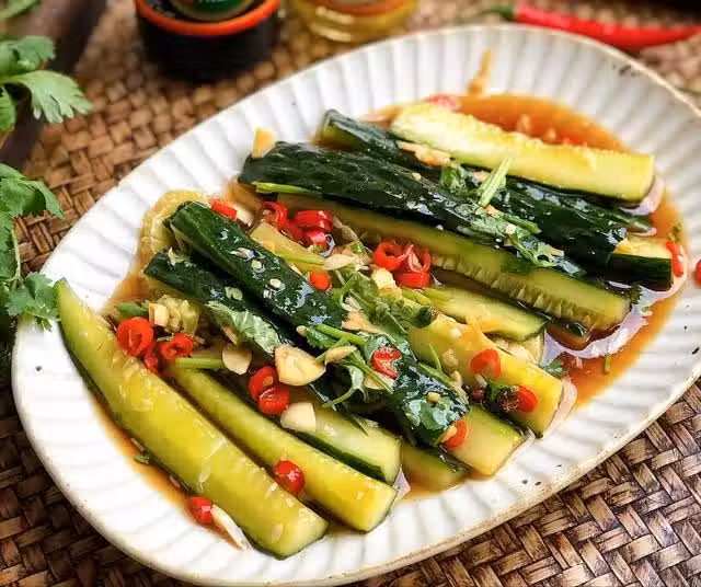 黃瓜、小米辣、鹽、香醋、白砂糖、香菜、生抽、蒜瓣