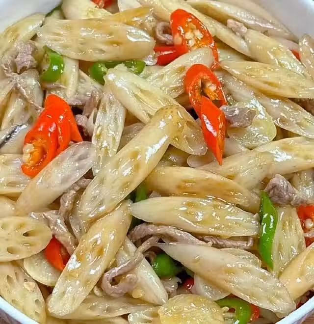 3.放入藕帶翻炒均勻,倒料汁,湯汁濃稠後加入青椒絲翻炒幾下出鍋裝盤。