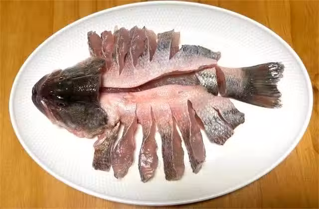 步驟二:魚身上先撒點鹽,倒上適量的料酒,抓抹均勻,給魚做個全身按摩,然後在切口處塞入一些蔥絲、薑絲,腌制10分鐘,去掉腥味。