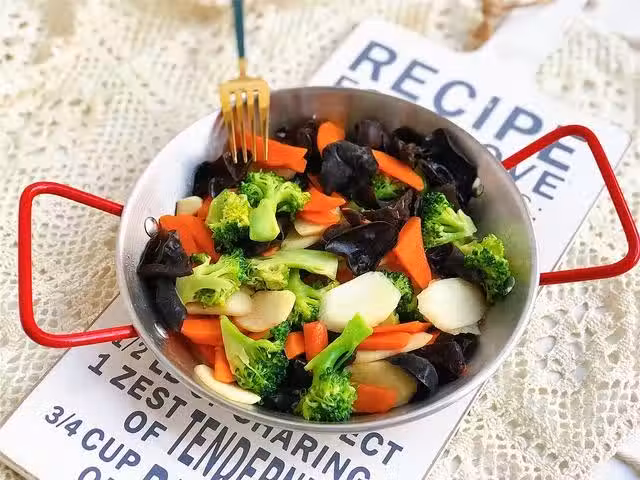 製作過程:1、我們先將西蘭花切成小朵,放入淘米水中浸泡一下,淘米水是很好的清潔劑,可以把西蘭花中的蟲卵和粉塵清洗乾淨;2、將山藥削皮切成薄片,放入水中浸泡;胡蘿蔔切成薄片備用;3、木耳先浸泡1個小時,使其充分泡發好。4、鍋中水煮沸後,把四種蔬菜分別下鍋焯燙,焯燙至斷生,撈起來沖一下涼水,使其保持清脆口感。5、 鍋中油熱後,加點蒜泥煸香一下,再把焯燙好的蔬菜一起下鍋,大火快炒出鍋即可,因為蔬菜已經焯燙熟了,就不要炒太久,以免失去清脆口感。