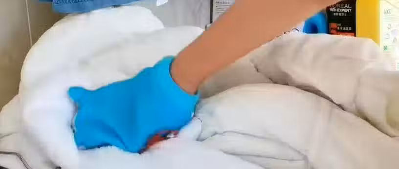 然後,拿出一條干凈的毛巾,將羽絨服擦拭一遍。對於一些較臟的地方,可以多擦拭幾遍。擦拭完畢後,大家可以看到羽絨服變得非常干凈,上面沒有任何污漬。