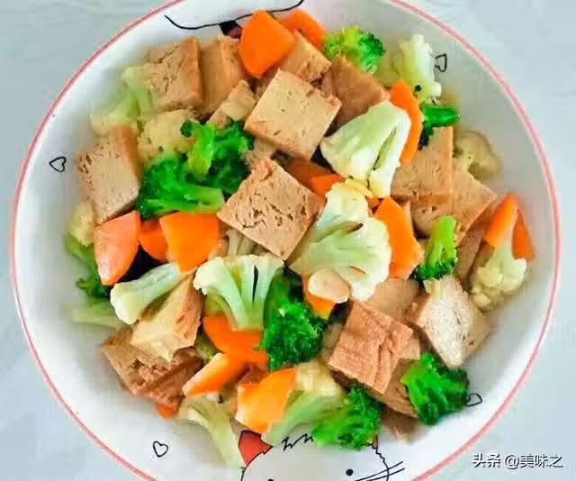 西蘭花200克、菜花200克、素雞豆腐200克、胡蘿蔔1段、蔥1段、姜1塊、蒜4瓣、油少許、蚝油少許、鹽少許、五香粉少許。