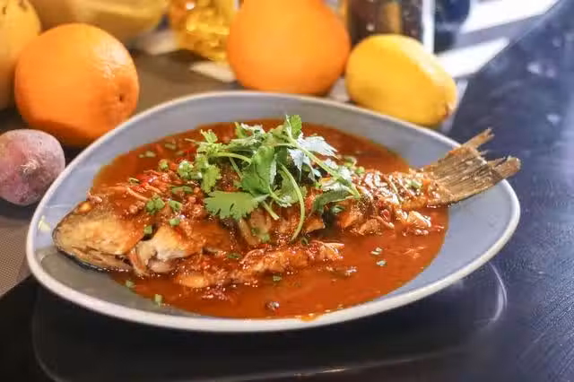 原料:海魚一條,五花肉50克,植物油一湯匙,鹽適量,蔥段2段,姜3片,蒜3瓣,醬油一大勺,料酒一湯匙。
