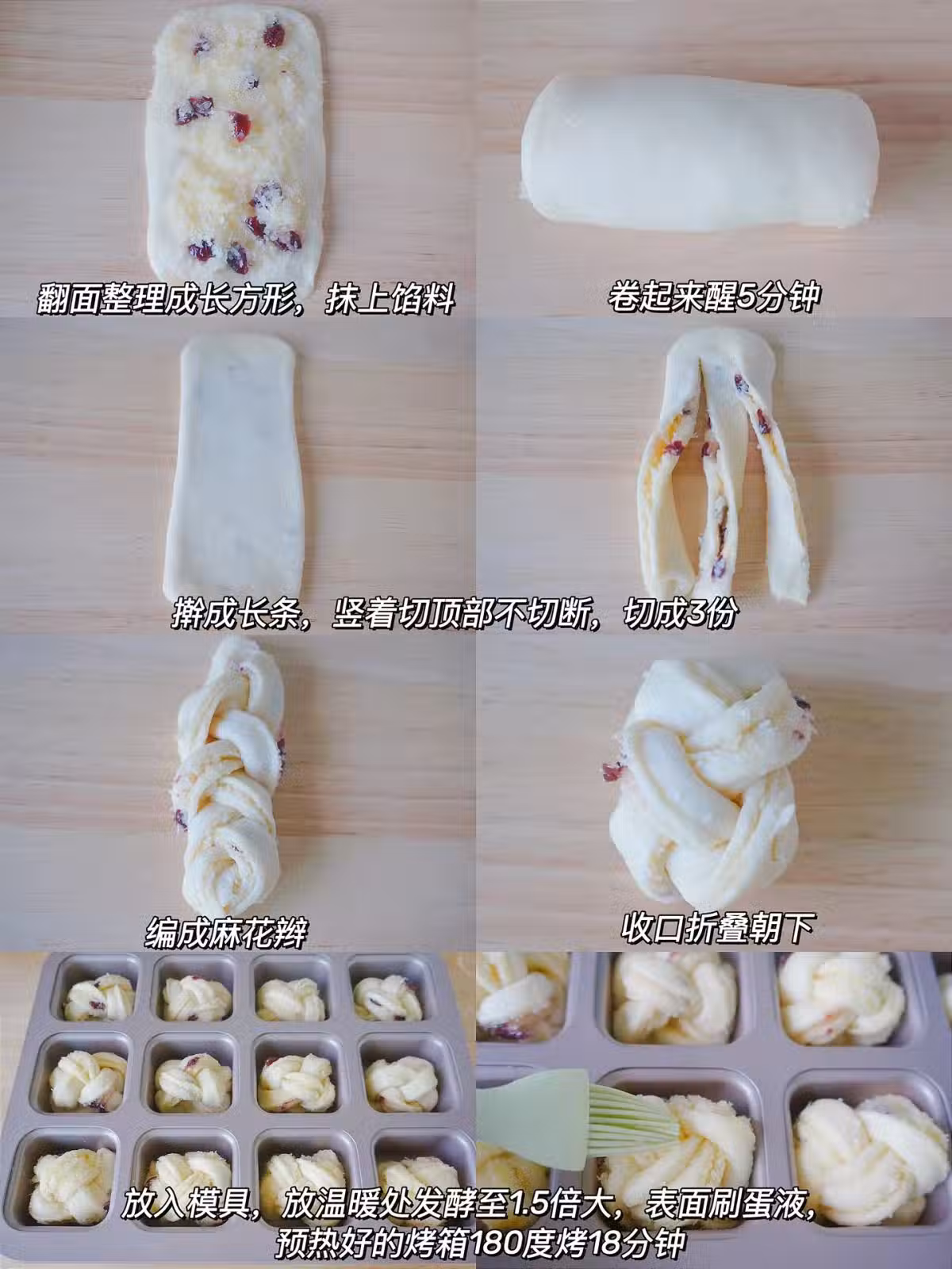 4️⃣麵糰取出排氣,分成12份揉圓,醒10分鐘,擀成牛舌狀,翻面整理成長方形,抹上椰蓉餡捲起來,收口捏緊,豎著切頂部不切斷,切成3份編成麻花辮,收口摺疊朝下放入模具,放溫暖處發酵至1.5倍大,表面刷蛋液