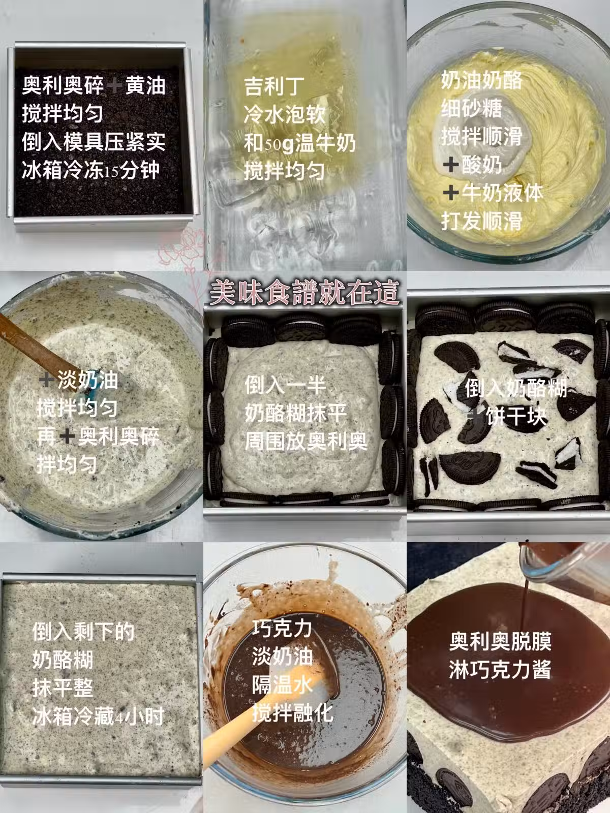 ⑤巧克力淡奶油隔溫水攪拌融化,奧利奧蛋糕脫模,淋上巧克力,裝飾即可