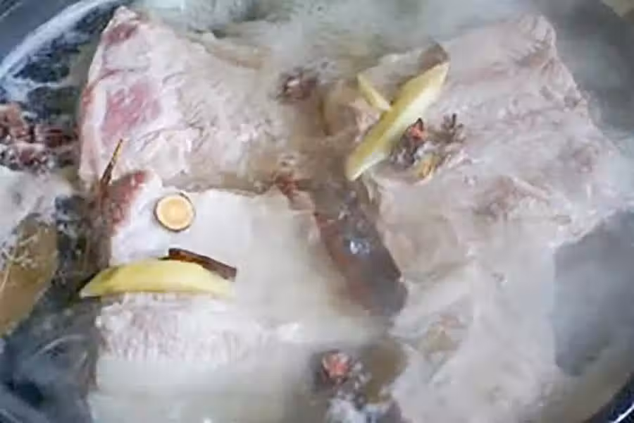 3. 煮好的肉給它倒出來,接著在豬肉上,倒上點老抽,豬皮朝下,浸泡在老抽中,泡上10分鐘再晾乾。+++