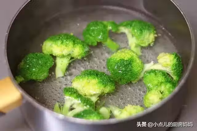 在水裡也可加入少許鹽,然後再焯。西蘭花大概燙一分鐘就合適了。完了以後,立刻用冰涼的冷水沖洗。