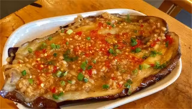 將新鮮的茄子切成片狀,用烤箱或炭火烤至香嫩。在烤制的過程中,茄子會釋放出濃郁的香氣,再搭配上蒜蓉、香菜和醬油的調味,讓茄子的美味更加突出。這道菜口感豐富,煙燻香甜,讓你愛不釋手。