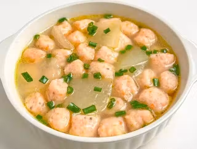 步驟三:鍋中油熱,先把薑絲炒香,再把冬瓜片下鍋炒軟,加入適量的清水煮五分鐘,關小火,把蝦泥擠成丸子下鍋,煮熟,加點鹽調味即可。