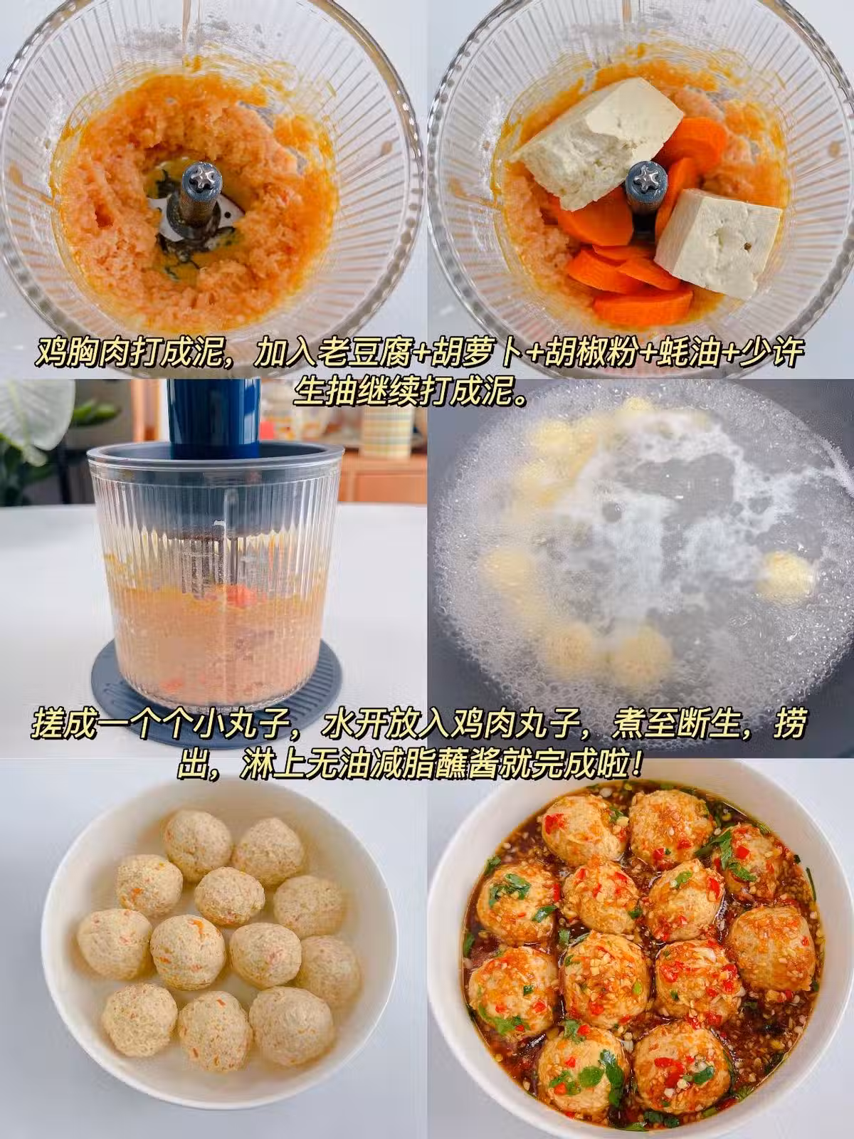搓成一個個小丸子,水開放入雞肉丸子,煮至斷生,撈出,淋上無油減脂蘸醬就完成啦!