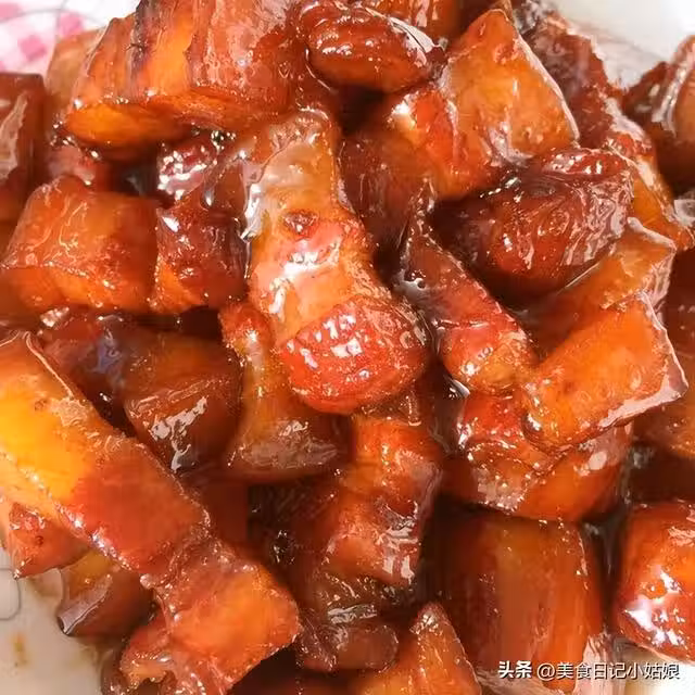 鍋中加油,放入冰糖,小火炒至融化,放入五花肉翻炒均勻,使五花肉裹上糖色。
