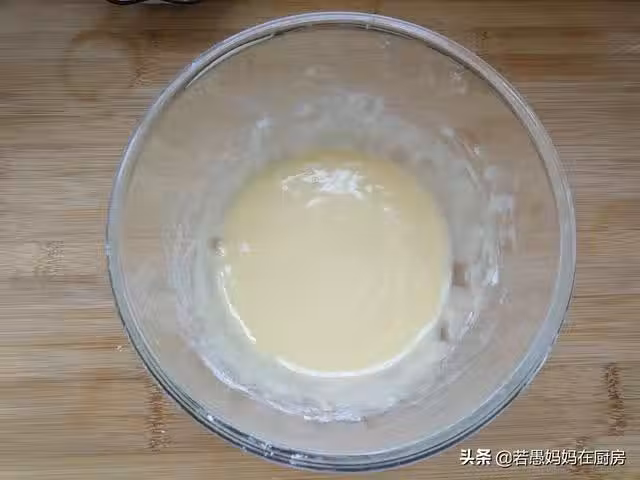 4、接著倒入椰漿,蛋清蛋黃分離後,將蛋黃也倒入麵粉中拌勻,最後拌成的麵糊呈流線狀態。
