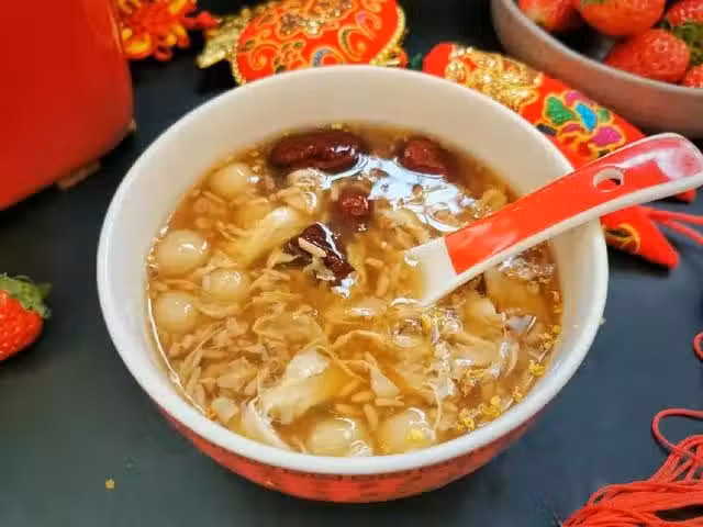 主要食材:糯米粉50克,溫水45克,雞蛋1個,酒釀1碗,桂花醬1大勺,紅糖1大勺